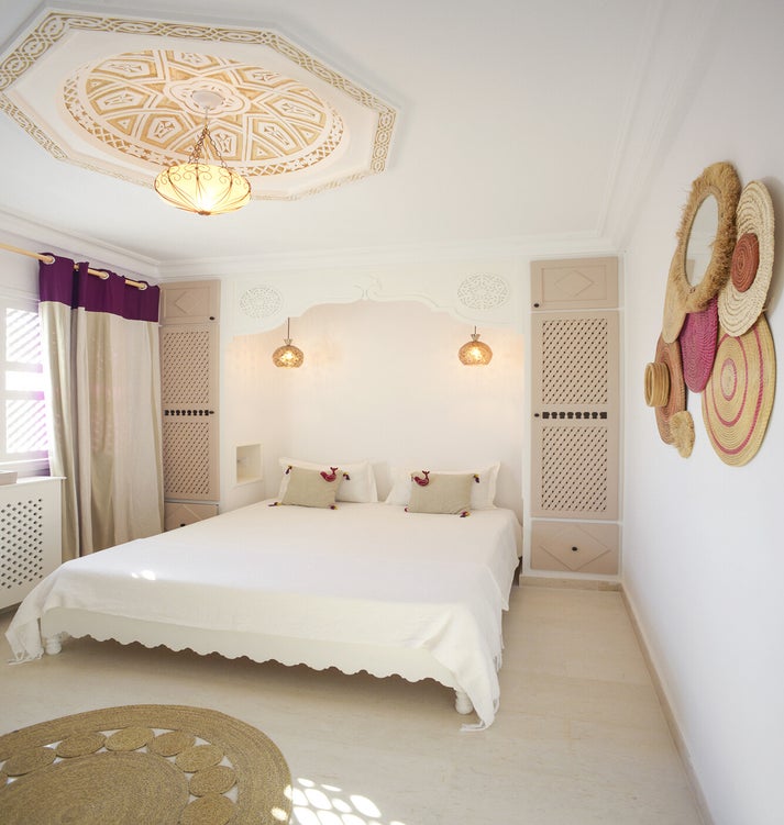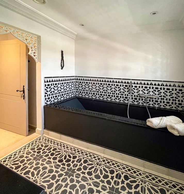 Baignée de lumière, la suite Mamounia de 18m² vous enveloppe dans une atmosphère chic et décontractée avec ses tons doux et chaleureux. La salle de bain, inspirée du style de Marrakech, est équipée d'une baignoire, d'une vasque, et de toilettes, vous invitant à la détente et au bien-être.